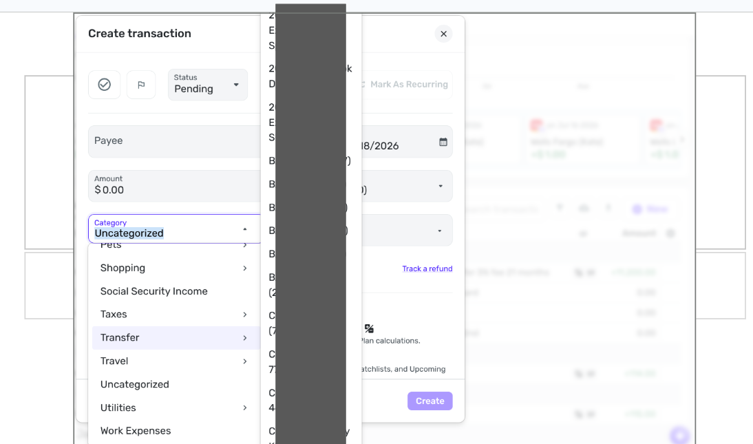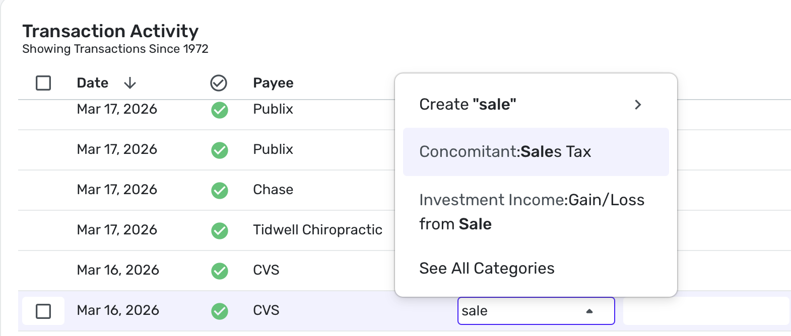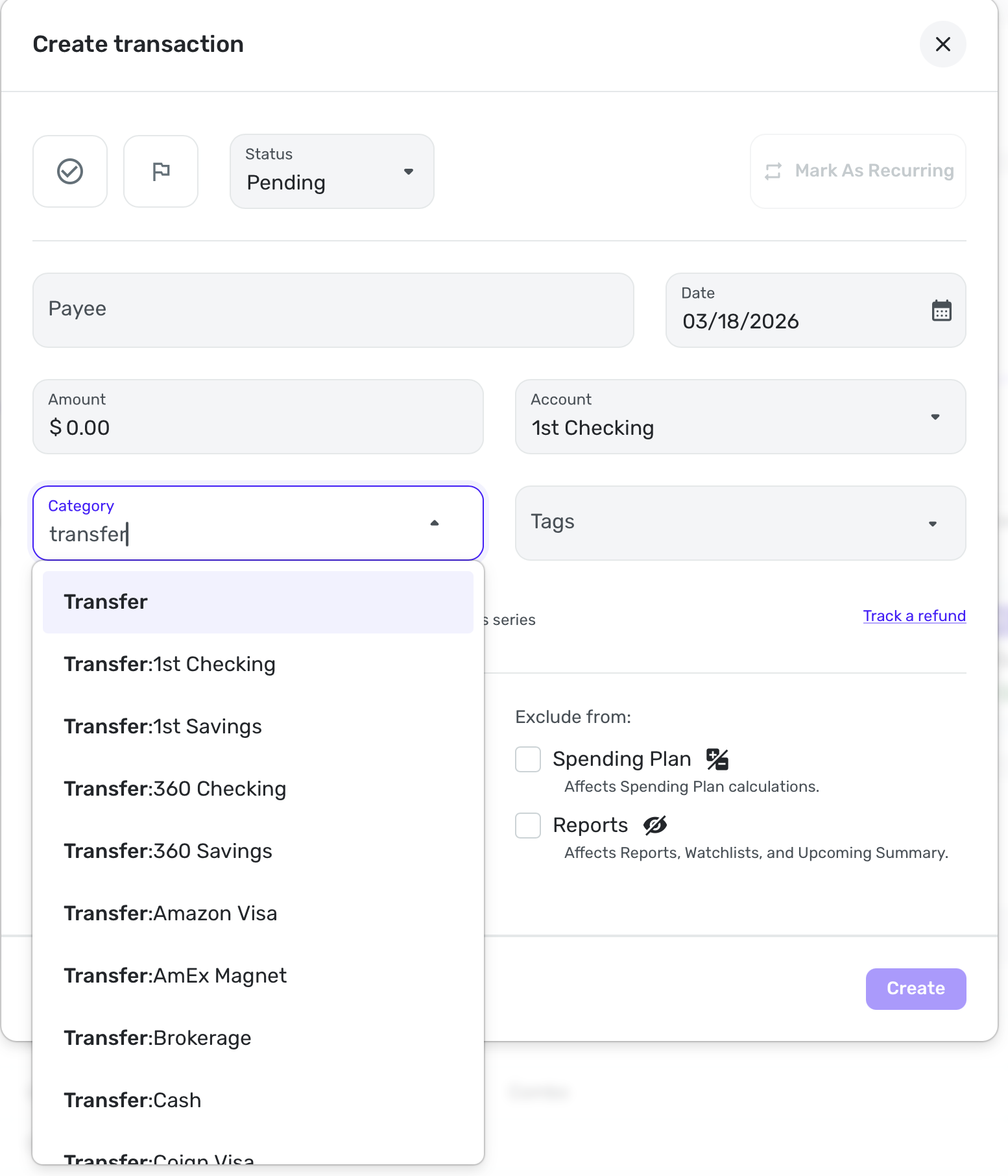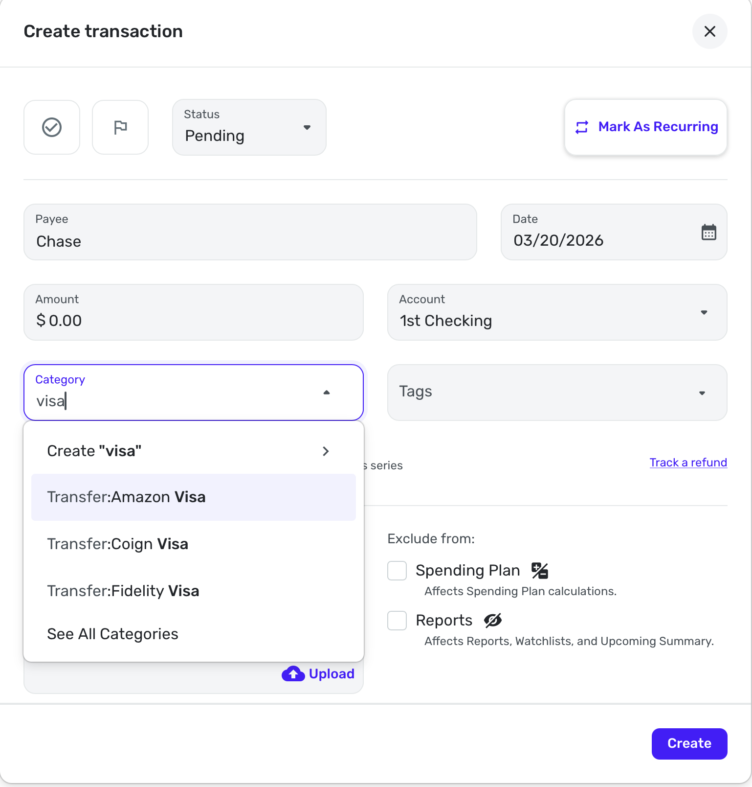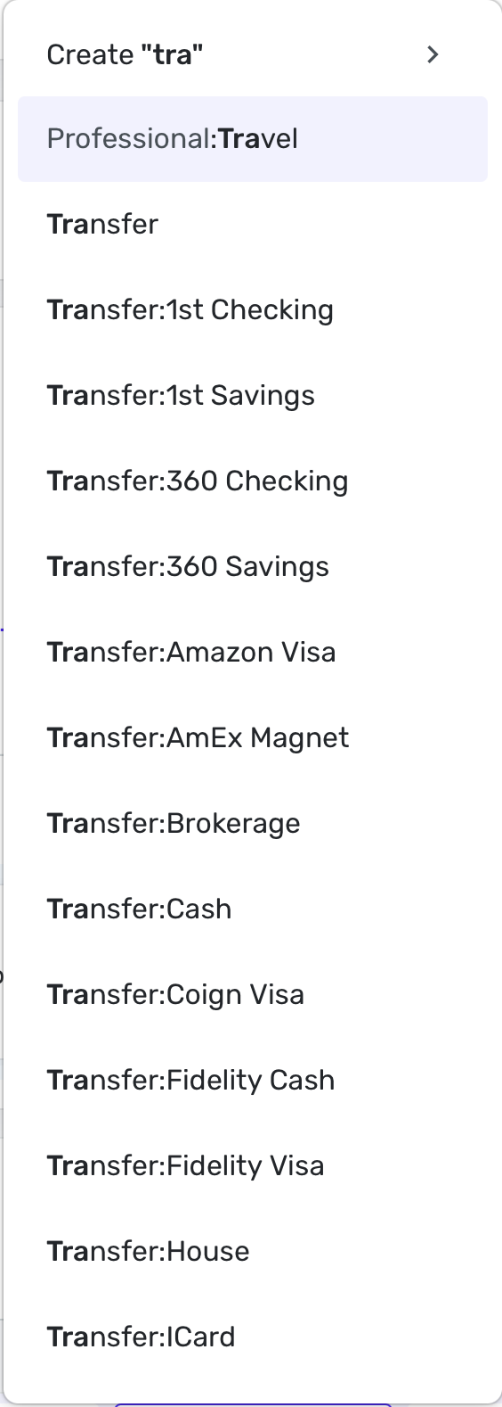 @DryHeat I was also confused when I first saw the posts from @SRC54 and @EL1234 . I've never seen that either. I guess the reason is they apparently type in the category, while I never do. For me, at least, it's much simpler and quicker to click the ⏷ and scroll to the category I want. Maybe they don't have a mouse with a scroll wheel? Dunno. I am so used to this that I flip the scroll wheel in the time it would take me to type the first letter and I can finish finding the category by the time I would have typed the second letter. When I want the category "Transfer" it takes me half a dozen letters to finally get to that category, as it sticks on Auto & Transport until then. I'm always trying to do things as quickly as possible, and I guess we all have different strategies which sometimes makes one procedure quicker than another. I think I remember in a previous post above that Steve deleted or renamed categories he doesn't use. (Maybe I dreamed that!) Anyway, I think that's why you were as puzzled as I was to see something like Steve's typing of "visa" and the popup menu he got. Just a different way of doing it.