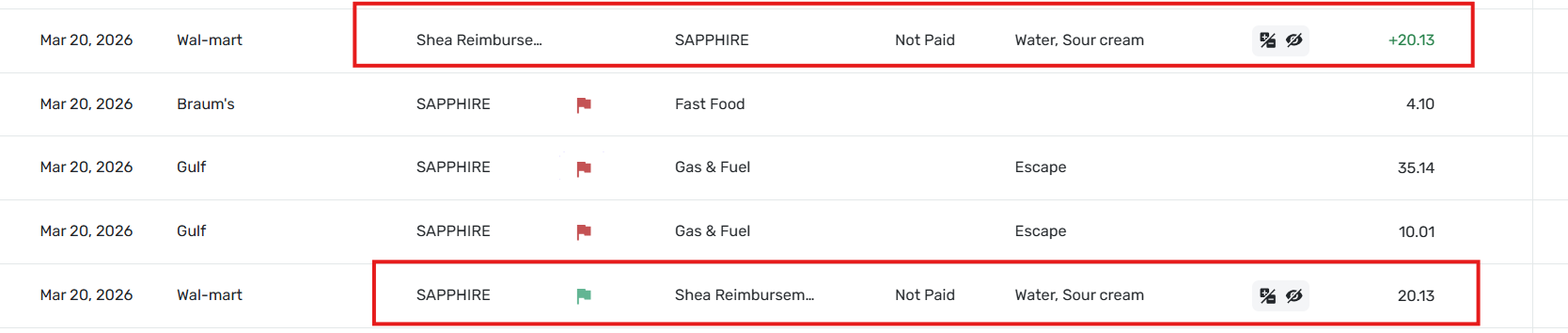Right now these transactions are categorized under a regular category ("Shea Reimburse") so they only exist in one account (if they exist at all). There are no matching "transfer" transactions.