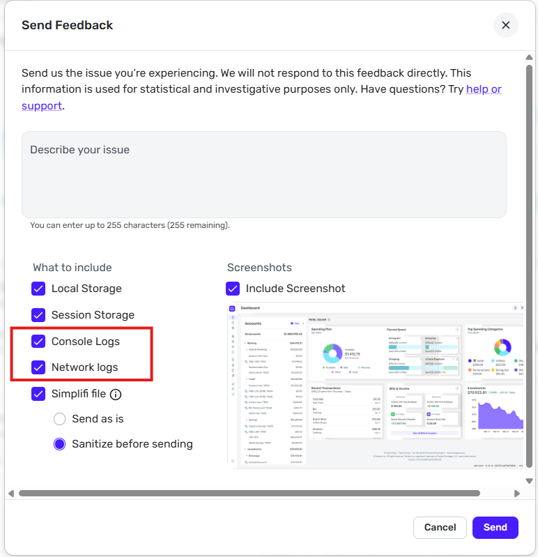 - Leave all boxes checked, add a brief description of the issue, and then click Send