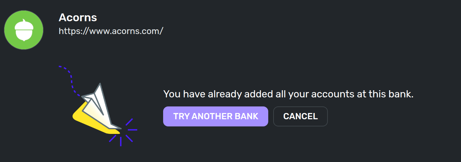 Acorns emergency funds are not appearing in my system. Whenever I try to find more accounts, the system says that I have added all accounts.