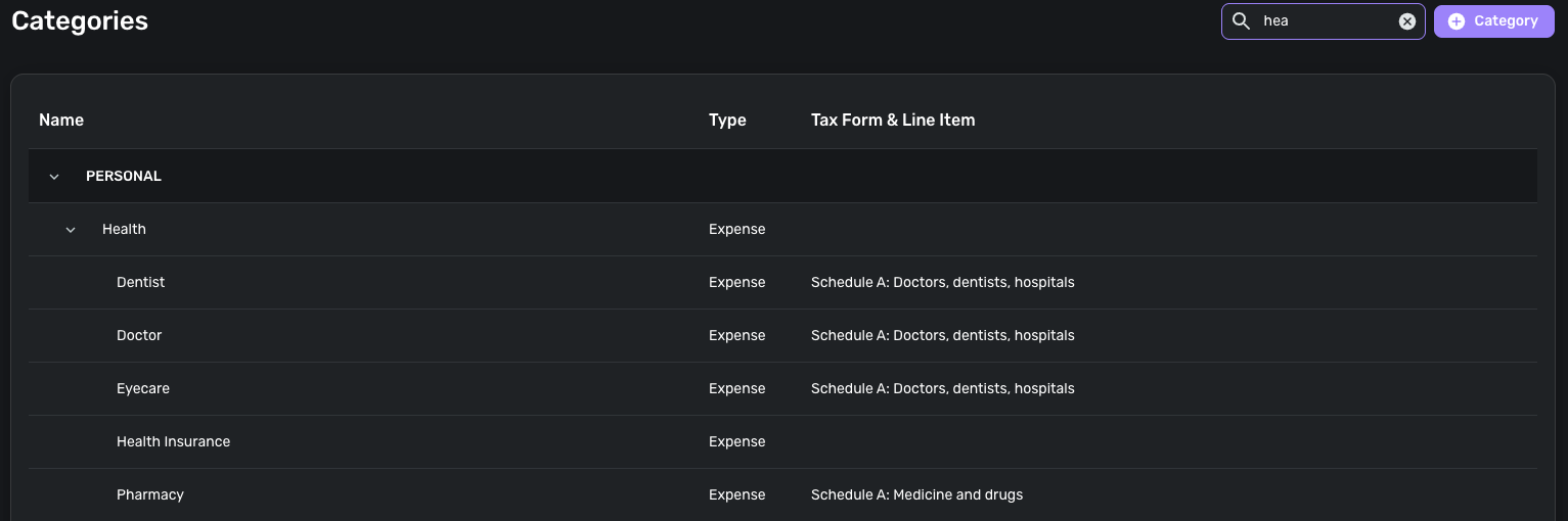 Thanks for reaching out! To keep track of expenses for tax purposes, you can ensure your transactions are labeled and categorized correctly. Quicken Simplifi already associates various Health categories as Schedule A tax items. So all you would really need to do is make sure the transactions you are trying to track use those categories.