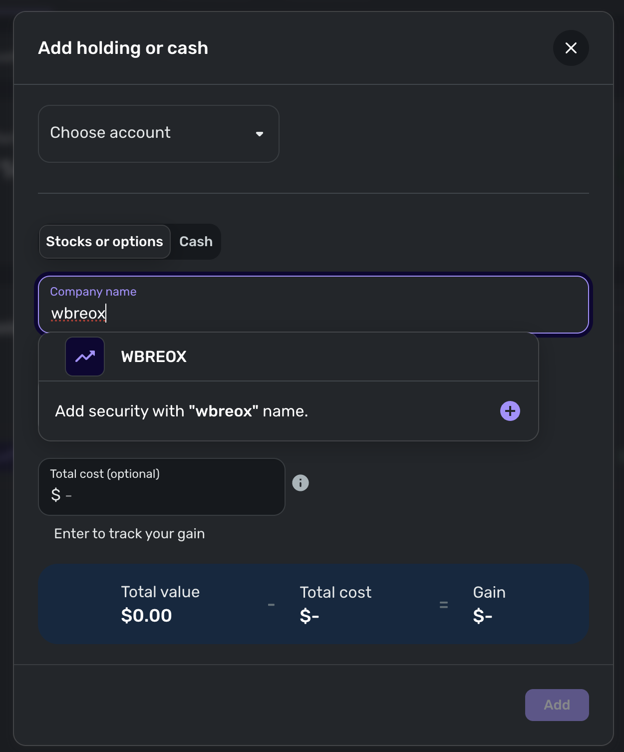 I'm trying to manually add WBREOX (https://www.quicken.com/investing/mutual-funds/WBREOX/BlackRock-Equity-Index-Fund) as a holding to one of my accounts, but Simplifi will not list it as an option. Instead, I have to manually enter it all the details rather than having it automatically update the share price.
