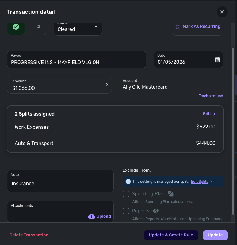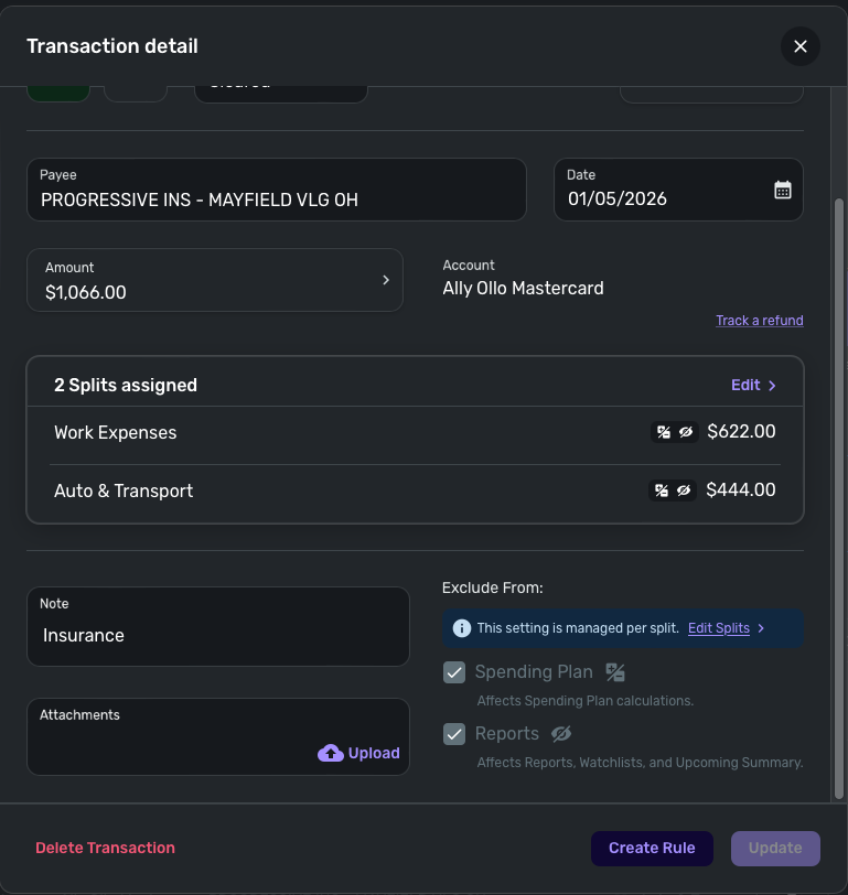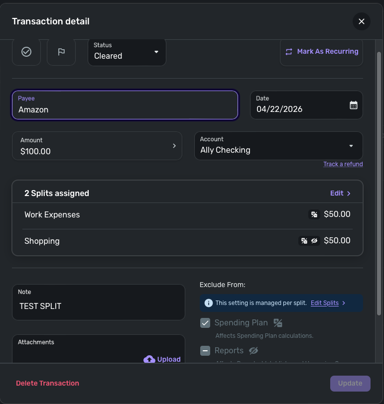 The new feature for individual split exclusions is perfect! Except the spending plan exclusion is not actually excluding it from the spending plan for me. The reports exclusion for the splits is working fine.