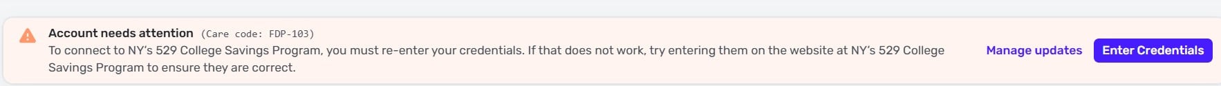 @Coach Natalie, thanks for the quick reply! I see the FDP-102 error but both days when I enter my credentials (which I confirmed work on the NYS 529 site), I get the error message I posted above.