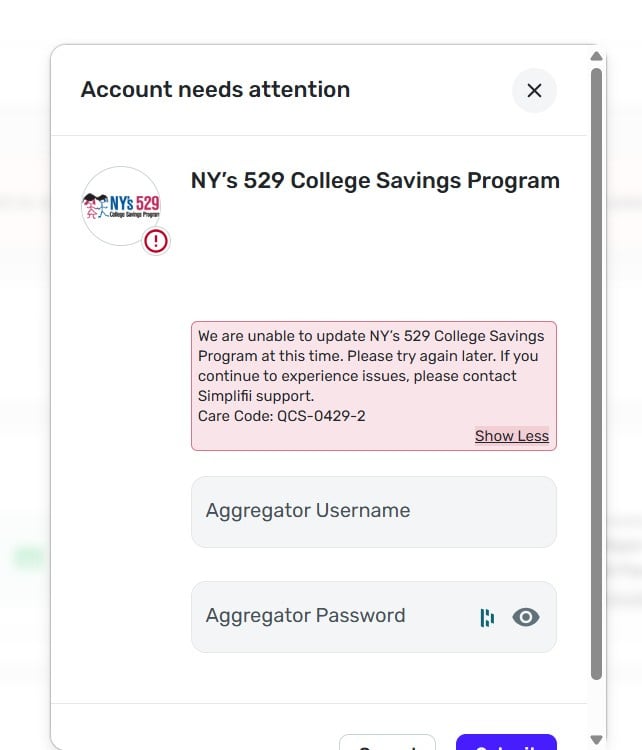 We are unable to update NY’s 529 College Savings Program at this time. Please try again later. If you continue to experience issues, please contact Simplifi support. Care Code: QCS-0429-2
