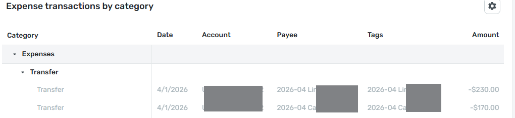 This month I made two contributions to two different Savings Goals. When I ran a Spending Report, those two contributions show up under "Transfer" (although their amounts are excluded from the totals). In the listing, the Account is the one I charged the contribution against. The Payee and Tag are the name of the Goal and its related auto-created Tag.