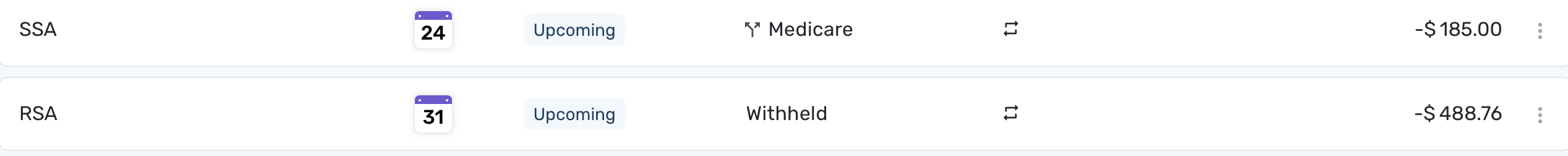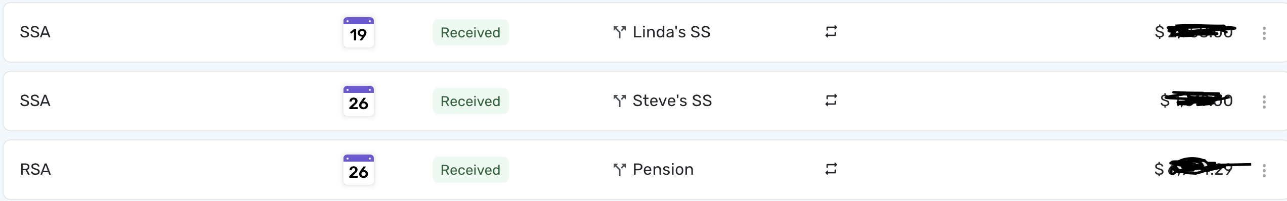 Here's what December looks like right now for Social Security and Retirement Pension (before receiving the pay). Actually, I've already entered this month's SSA as a future transaction so that is why you see the split symbol, which isn't there until you tie the split transaction to it.