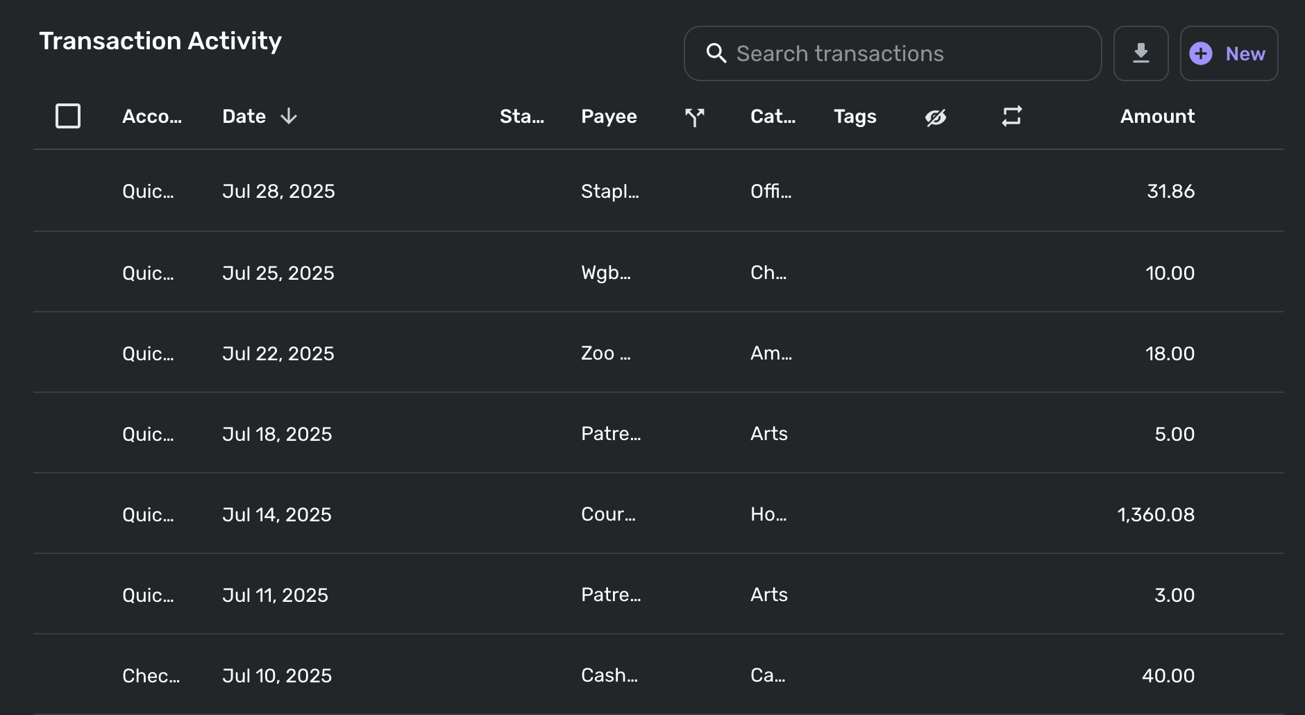 Here's a sample of my completely unreadable transaction activity in other spend. Note that for me the most important categories are Payee, Category, and Amount, two of which are incomprehensible as-is.