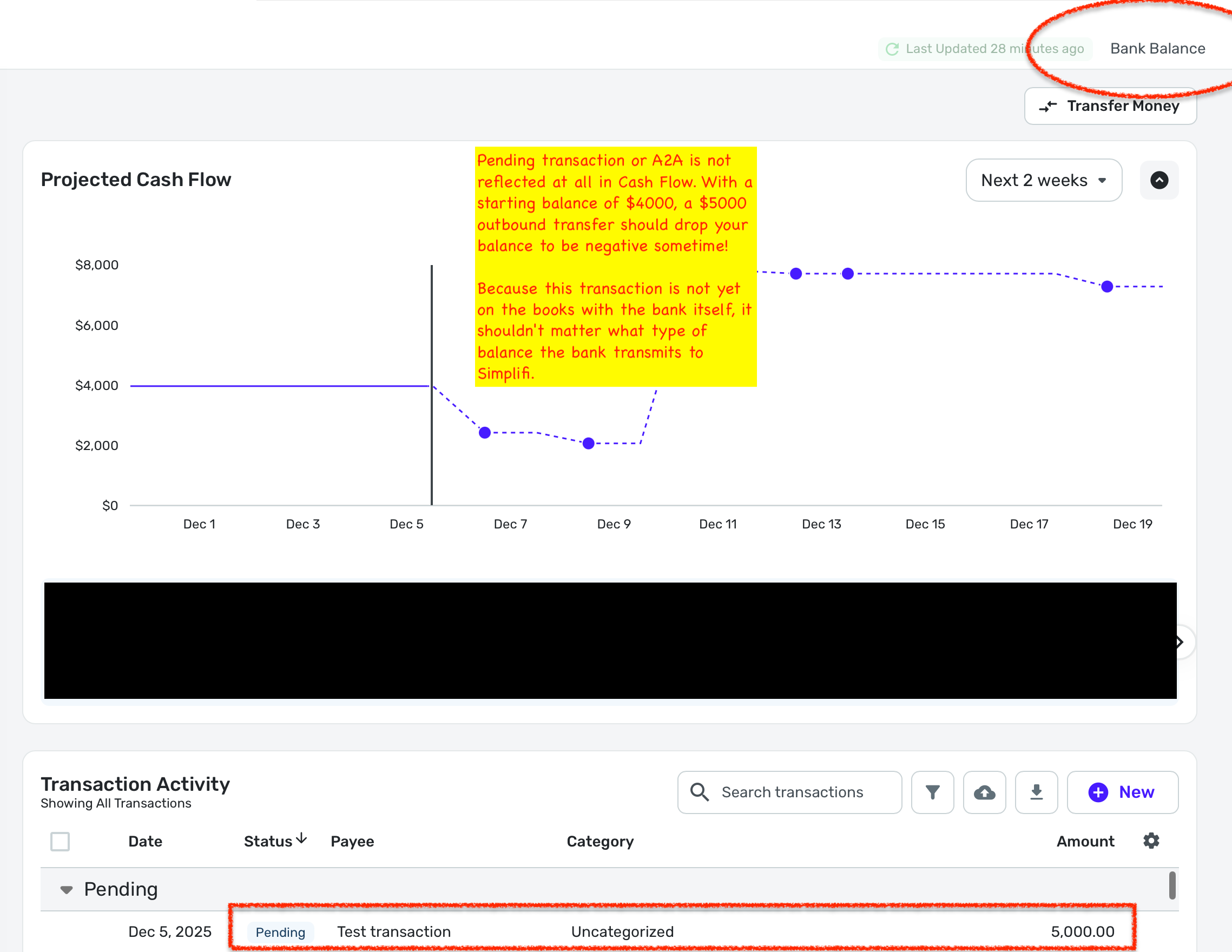 ACTUAL OUTCOME: Under displayed balance type of "Bank Balance," the $5000 pending A2A or expense is never reflected anywhere in Cash Flow. You have to change the balance type to "Balance with Pending" in order to "see" it -- in which case, the Pending transaction is manually added/subtracted BY SIMPLIFI to the balance it received from the bank.