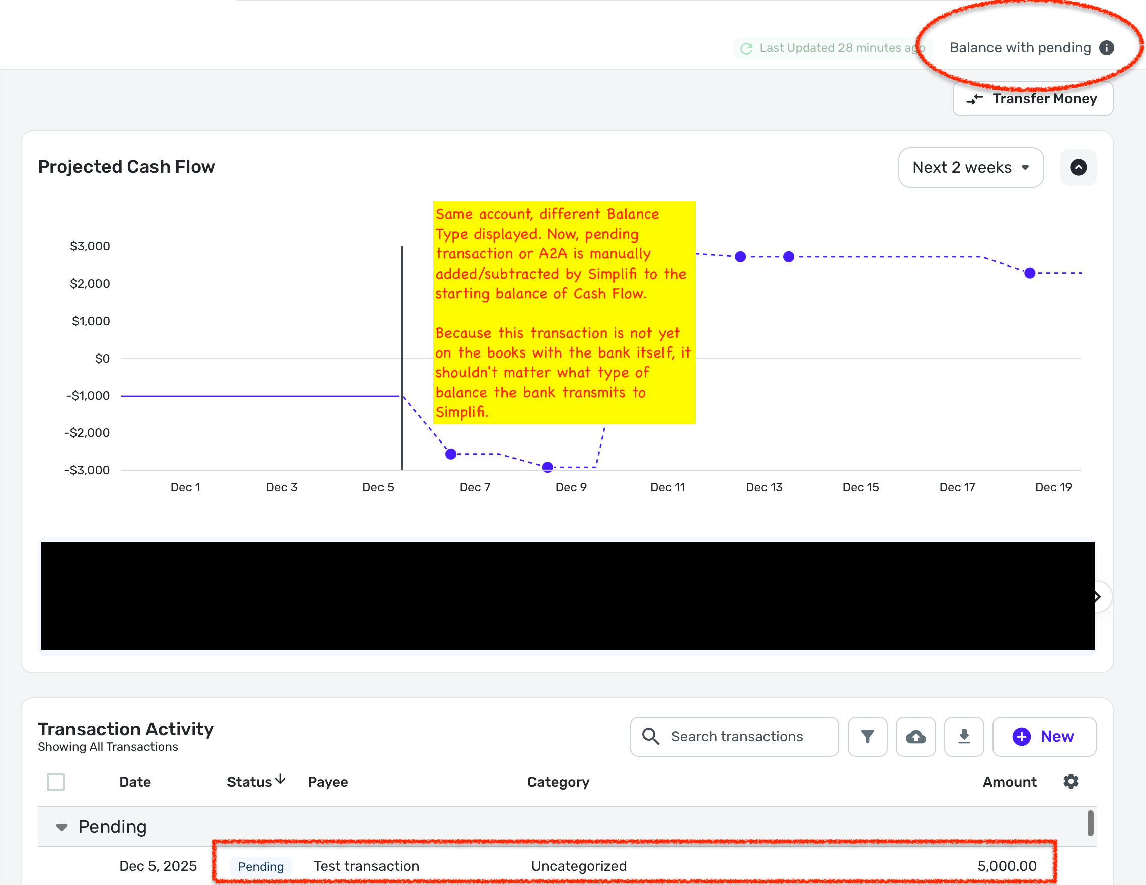 PROBLEM: User-created Pending entries in Simplifi -- either manually-created Pending transactions (that have not yet sync'd up with a statement line from the bank), or Simplifi-initiated A2A transfers -- are only reflected in Cash Flow when the Balance Type is set to "Balance with Pending", regardless of what the bank is actually reporting.