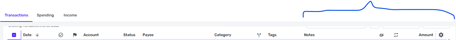 I am wondering if the Flag, Reviewed, Exclusion, and Recurring columns take up more space than they used to. It might just be those last two. Any way you can reduce some of the real estate they take up to make more space for the other fields? (On my smaller monitor, the Amount field is cut off, I managed to make room for it by shrinking Payee.)