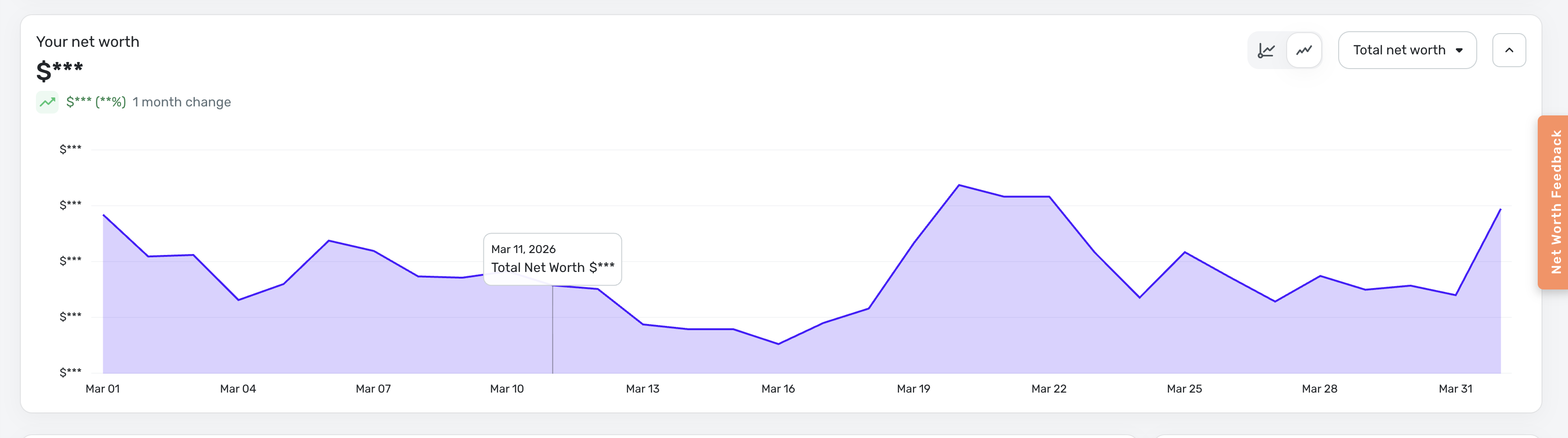 - Nit: When switching between Net Worth and Assets vs Liabilities, everything on the page re-renders, similar to the last nit. The spinner changes places and feels a bit janky. Similar to the line above, not a huge deal by any means but could be neater.