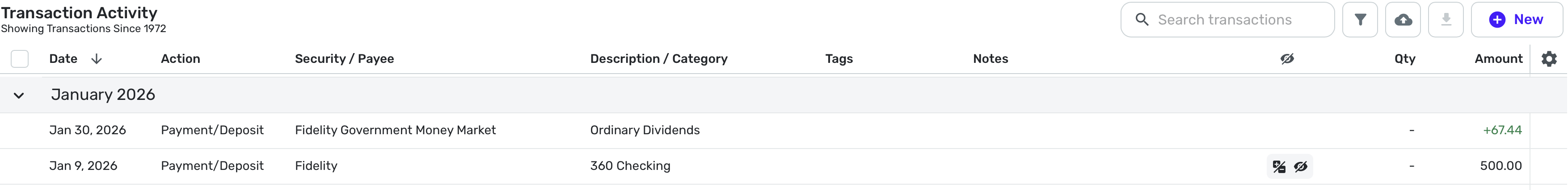 Thanks this should work for now. I'm hiding all these brokerage transactions from my day to day Spending Plan until the spend actually happens, mainly to keep my head sane! Its largely building up a fund for known quarterly one off expenses like Estimated Taxes. It is exactly like holding the money in a Savings account (I prefer Vanguard's higher money market int rates). I am also keeping the Dividend income showing in all reports so I can track the total income vs spending including tax payments.