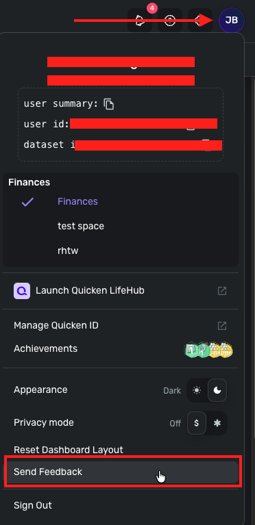 - With the Profile menu open, hold down the Option key (Mac) or the Alt key (Windows), and then click Send Feedback.